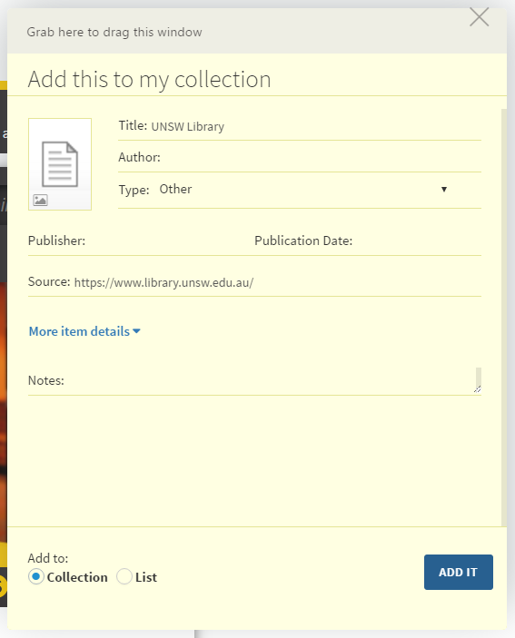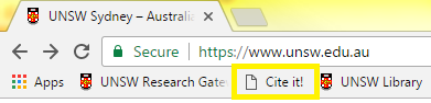 In a new tab, open the website/link to be added to the reading list. Click the Cite it button on your tool bar to prompt a pop-up. In this box, complete the relevant information.